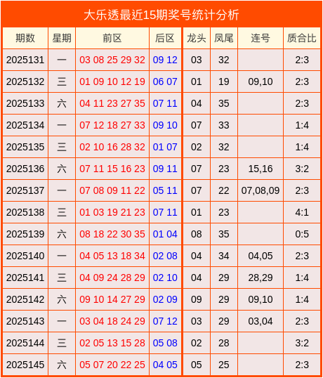 开奖转头:大乐透第2025145期奖号:05、07、20、22、25+04、05。其中龙头为05,凤尾为25,质合比为2:3,无连号。